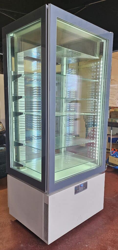 Vitrine bi-température occasion 5 étagères en verre réglable Dim. étagères 69 cm x 41 cm Dim. hors tout Larg. 80 cm x prof. 65 cm x H. 183 cm Ce produit m’intéresse